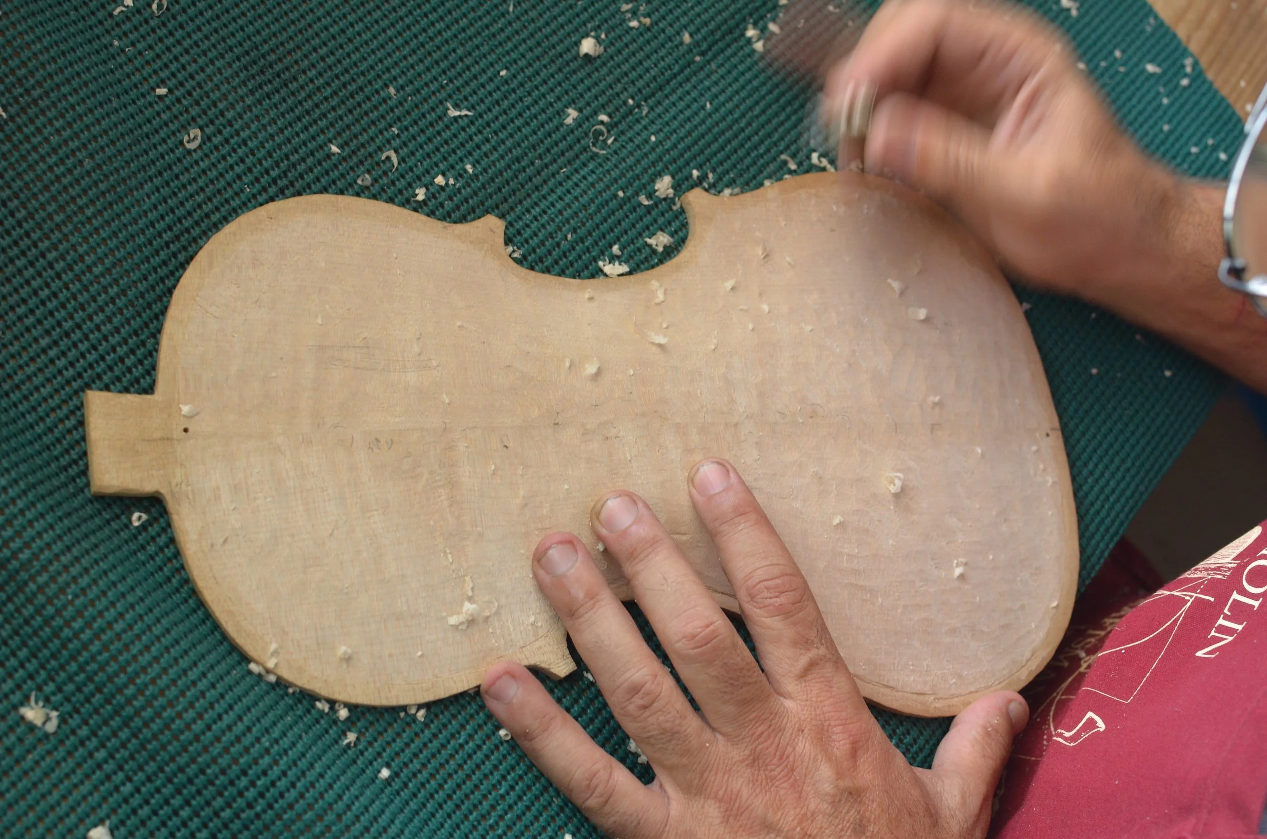 Then, a suitable piece of maple is selected for its appearance and tonal resonance. We split it in two and join the halves at 90 degrees from the split line, to produce the beautifully symmetric and wavy appearance of a violin’s back. The piece is then flattened, and the instrument’s body outline is sawn.