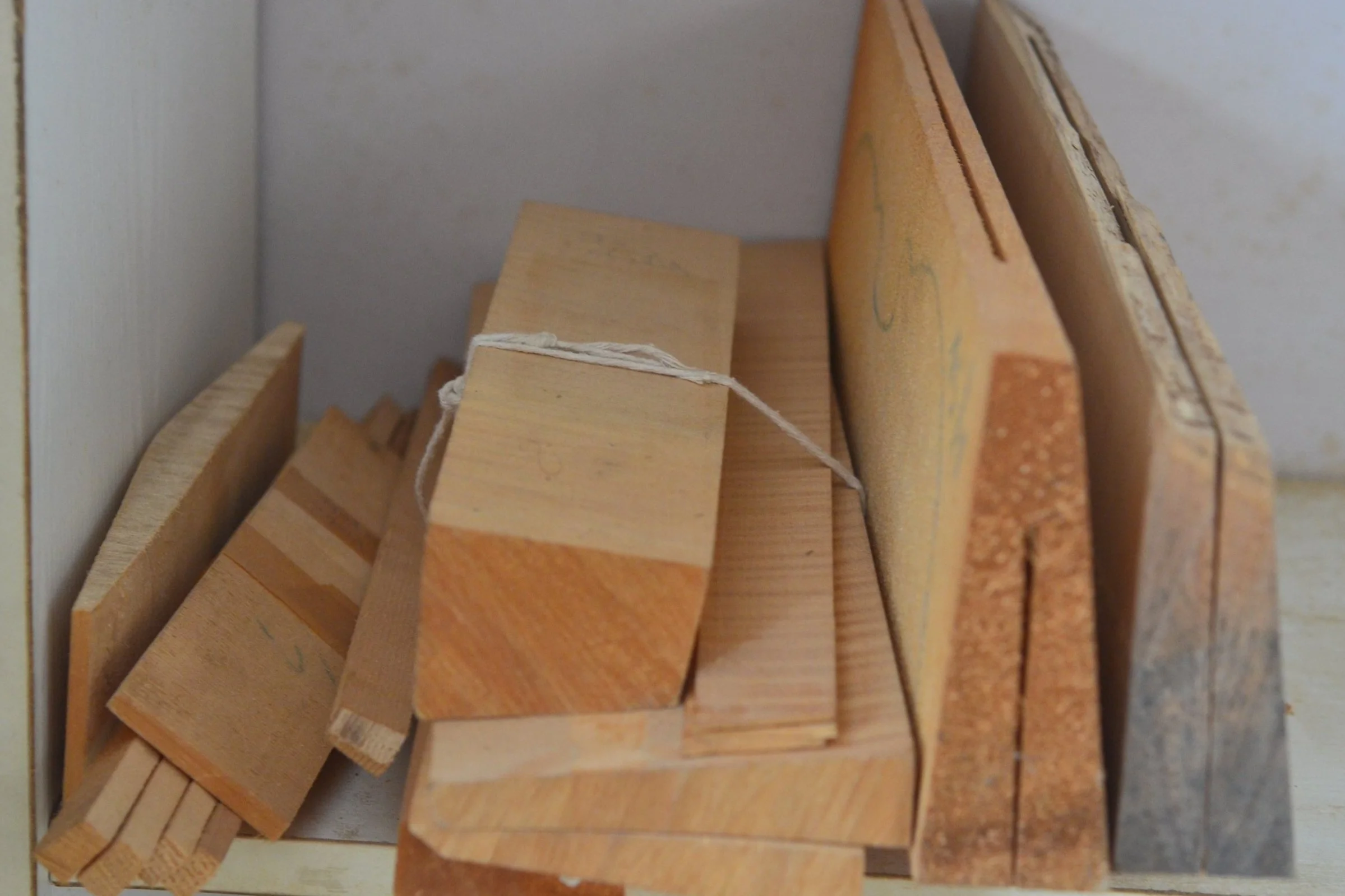 The rib assembly is first constructed by gluing blocks of willow to the mold, and then gluing thin maple ribs on top of them to form the basic structure that will connect the back and top of the instrument’s body.